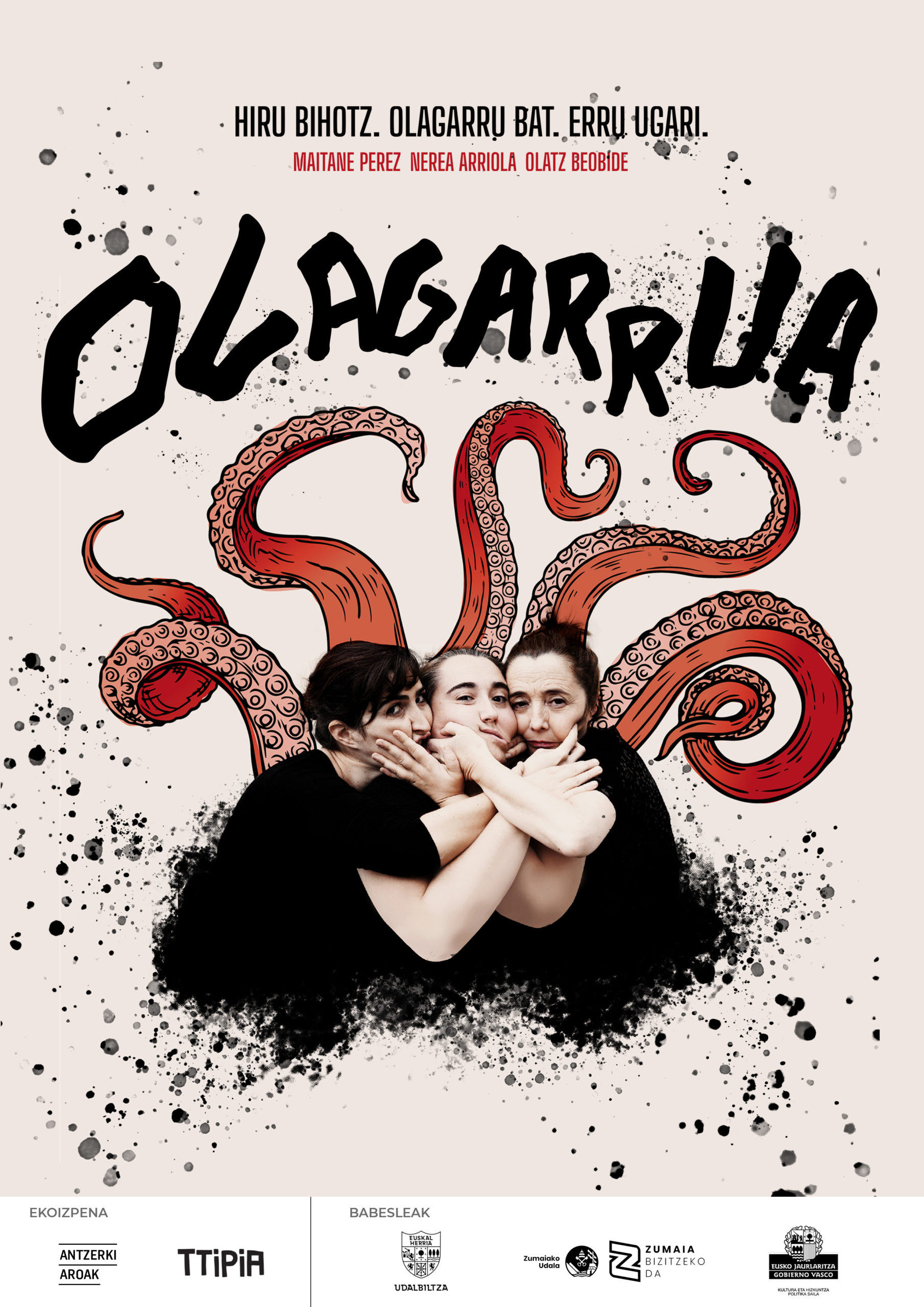 Errudunak gara? Errugabeak? Zerk egiten gaitu errudun? edo nork? Gure errua, gure errua da? Ba al daude erru txiki eta handiak? Erru kuttunak askatu nahi ditugu? Erru potoloak kiloka neurtu daitezke? Oholtza bat. Olagarru bat. Hiru emakume. Hiru bihotz erruarekin jolasean, olagarroaren eta gizakien munduak nahastuz, erroak eta erruak korapilatuz, itsas azpian eta lur gainean biziraun nahian. Hiru aktore erruak astindu nahian, olagarroak haren zortzi erroak astintzen dituen moduan. Obra posible asko obra bakar batean, poetika ezberdinetan mimetizatuko direnak, zuloetan sartuko direnak, barrearen bidez arnasa ekarriko dutenak eta behar izanez gero, tinta beltza jaurtiko dutenak, bizirauteko. Oholtza bat. Olagarro bat. Hiru emakume. Eta askoz gehiago.