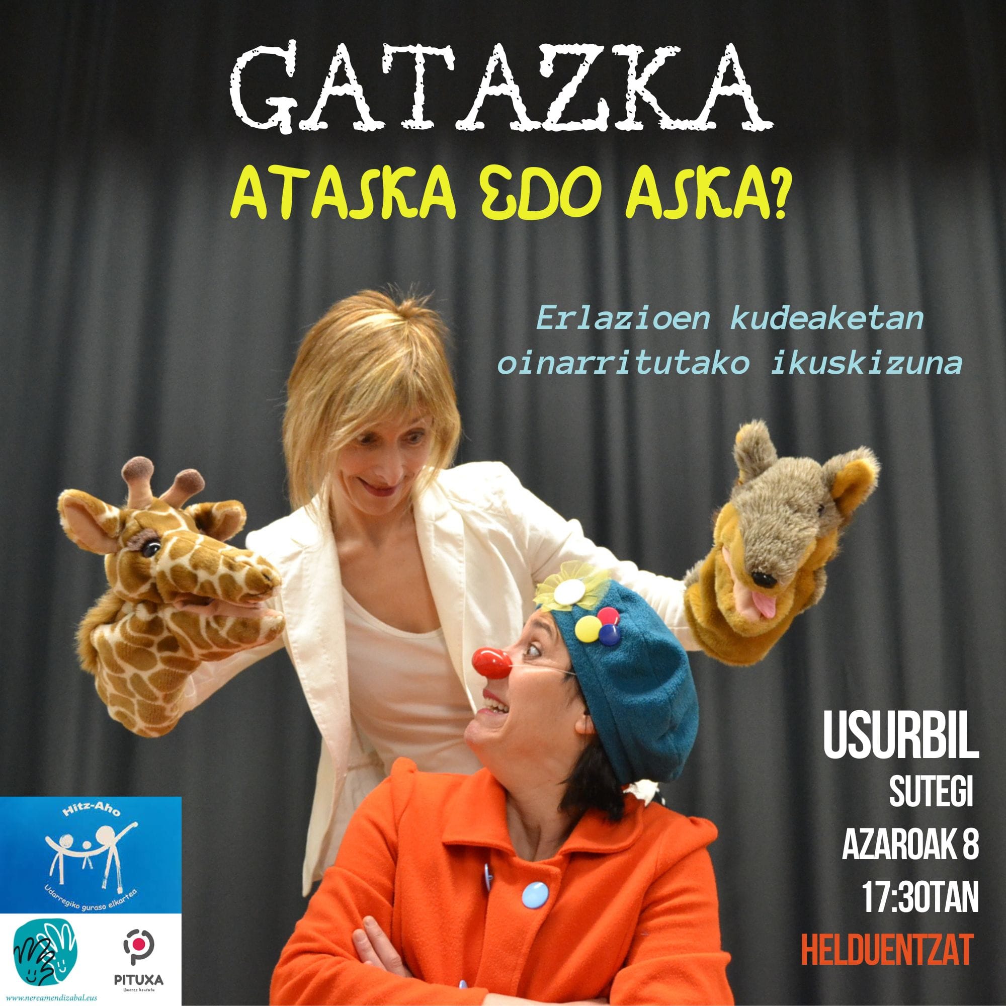 Nerea Mendizabal psikopedagogoak eta Itziar Saenz De Ojer “Pituxa” pedagogoak harremanen inguruan hausnartzeko begirada umoretsua duen kantu eta elkarrizketa saioa eskainiko dute. Komunikazio ez bortitzaren ikuspegia antzerki, umore, musika eta edukiekin nahastutako ikuskizun dibertigarri honek edonorentzat esanguratsuak zaizkigun egoeretatik askatzeko arintasuna eskaini nahi dira.