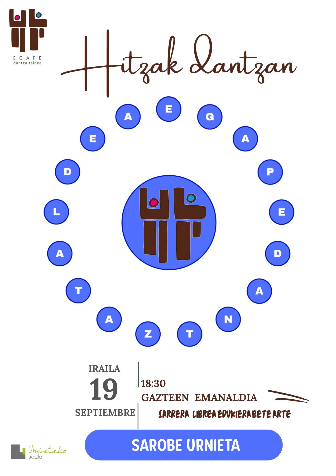 Egape Dantza Taldeko 49 dantzari gaztek ikasturtean zehar egindako lana jendaurrean aurkeztuko dute ikuskizun berritzaile baten bidez. Emanaldi berezi honek dantzaren bidez hitzak harilkatuko ditu, 16 koreografia originalen bitartez bertsoz bertso uztaia osatu arte.