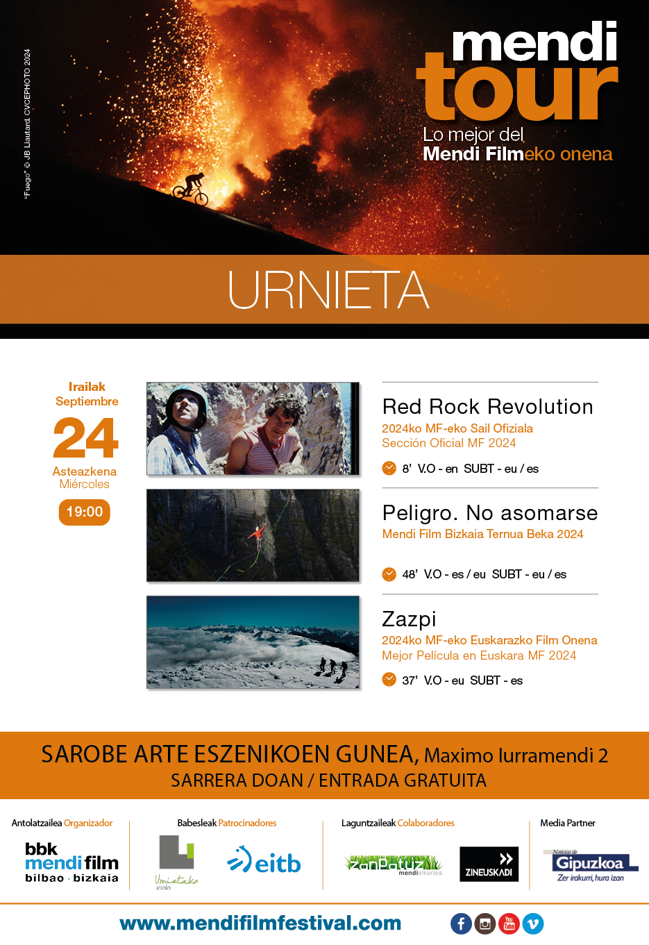 Abentura, adrenalina, umore ona eta hausnarketarako gaiak ere badira pelikula horietan: eskalada Amerikar Estatu Batuetako Red Rock Canyonen, trail runninga Euskal Herriko gailurretan, eta high-line lerro ikusgarri bat Nerbioiko urjauzian erakutsiko dituzte.